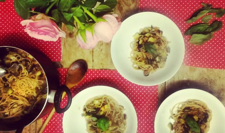 Made this delicious pasta for my dear veagan friend’s Bday last night and I got a thumbs up so here’s the recipe. Ingredients: 2 Aubergines 2 Courgettes 1 Garlic clove 1 Red chilli 1 Bunch of basil 1 Red onion … Continue reading Spaghetti alla Vegana