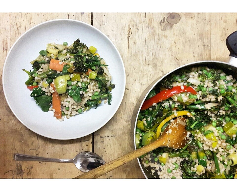 Cook the pearl barley separately, following instructions on pack as cooking time might vary but I started cooking mine when I started frying the veggies and they were done at the same time 🙂