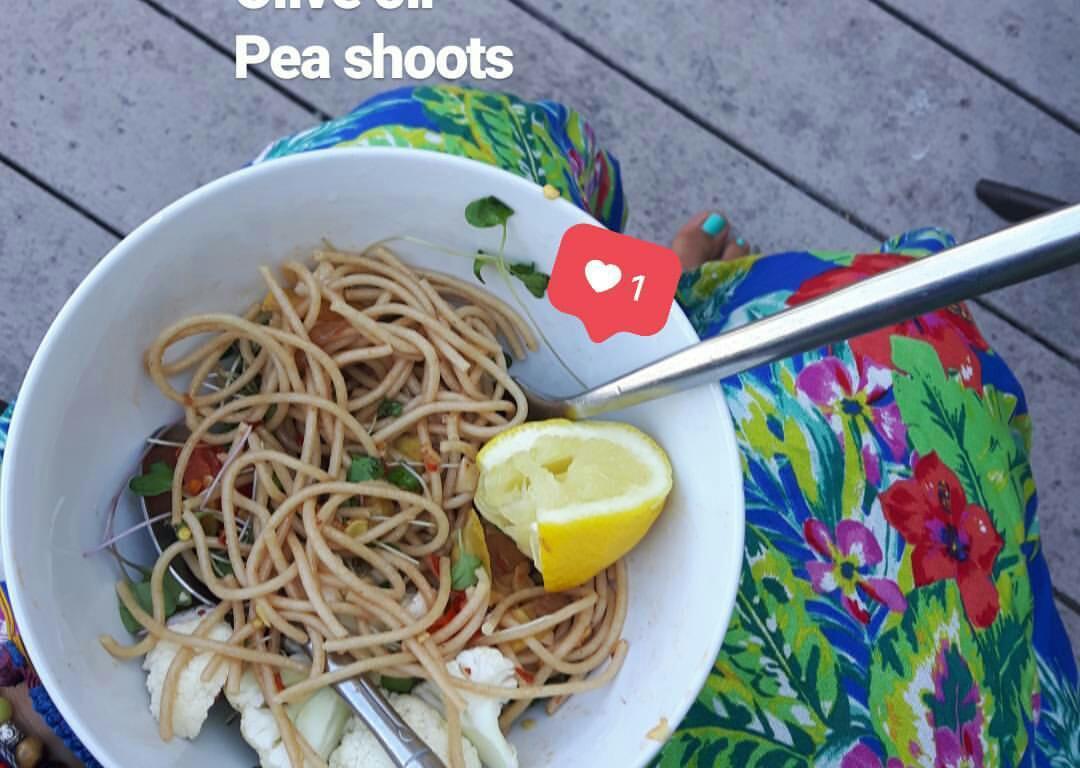 Serve in a hollow plate if poss and add the extra virgin olive oil and a handful of pea shoots on top.