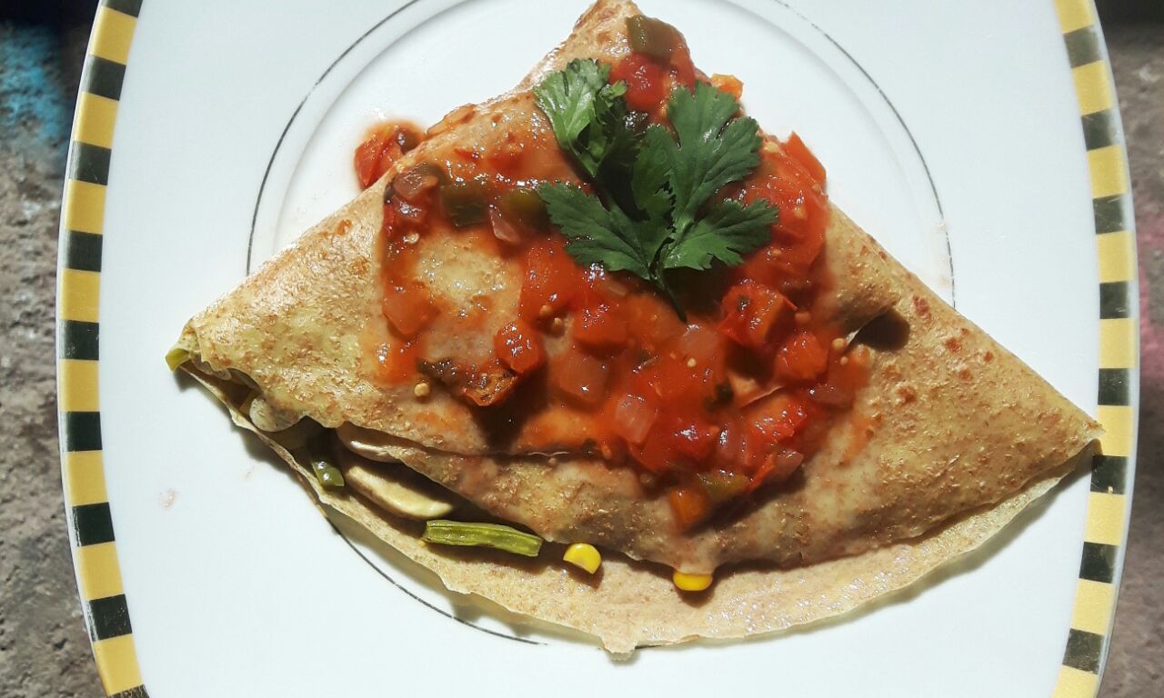 Crepe a la mexicana with cactus (can be replaced with green pepper), corn and mushrooms topped with a spicy tomato salsa